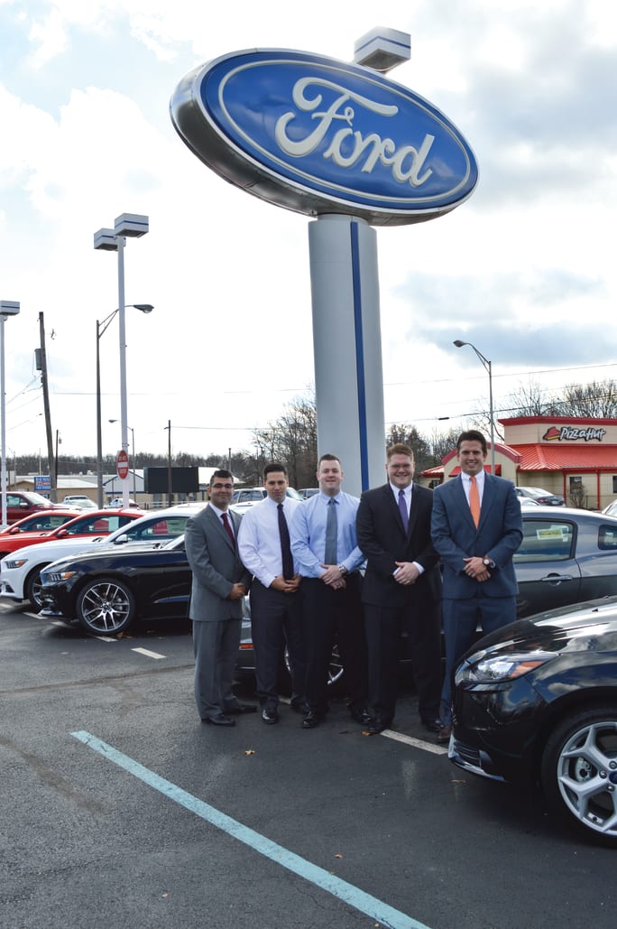 Faulkner-Ciocca Ford is part of the nine-store Faulkner-Ciocca family of dealerships. It retails about 1,200 new vehicles a year and is No. 1 in Ford F-150 and Mustang sales in its region. Pictured are members of the dealership’s sales and F&I teams, including (l-r) General Manager Agyhad Antonios, F&I Managers Luke Freitas, Pete Dobrowolski and Jeff Rowe, and Finance Director Kyle Egge.