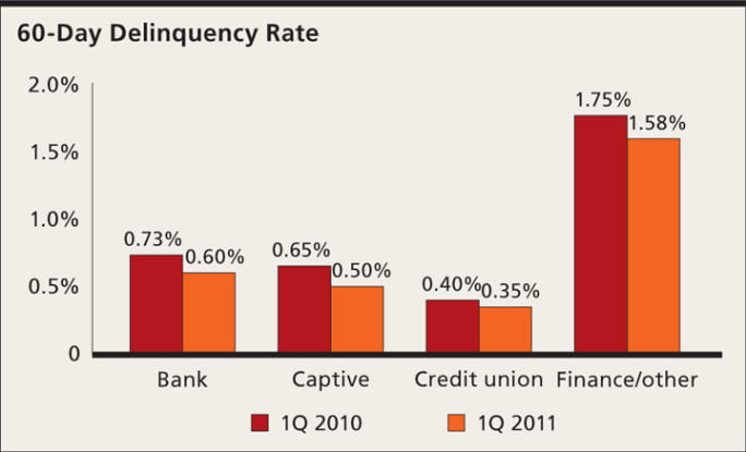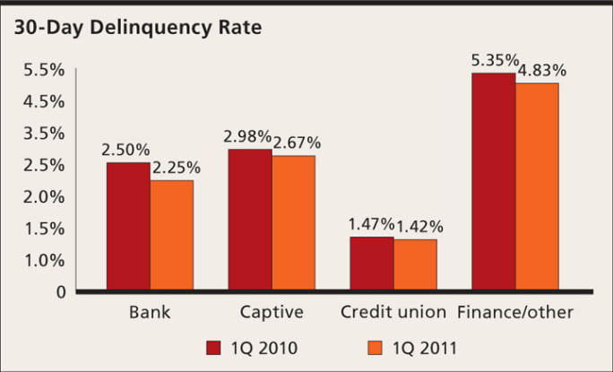 Thirty-day delinquencies are at their lowest point since the fourth quarter of 2008, giving lenders a little more leeway in their credit decisions. Having dropped 7.95 percent, 30-day delinquencies contracted to 2.52 percent in the first quarter from 2.74 percent a year ago. Sixty-day delinquencies dropped by 13.45 percent in the same period, with the captive finance segment enjoying the largest decline.