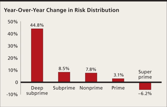 The share of loans to credit-challenged new-vehicle shoppers increased 11.1 percent from the year-ago period. The share of loans made to the nonprime segment increased from 9.71 percent in the year-ago quarter to 10.57 percent. The share of loans made to subprime customers jumped from 5.67 percent to 6.16 percent, while the share of loans made to deep subprime customers rose from 1.38 percent to 2 percent.
