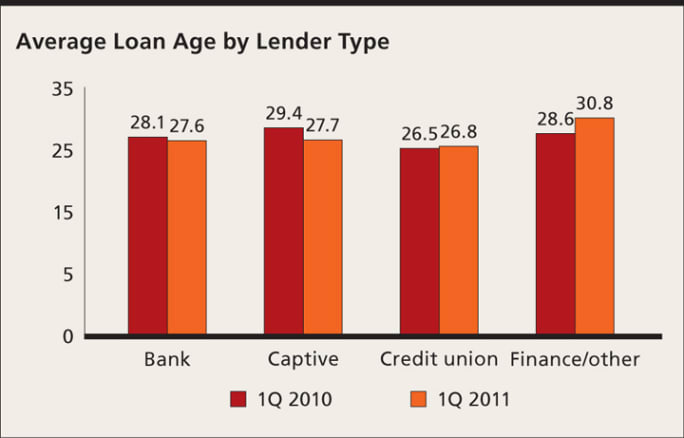 Among lenders, loan age for banks and captive lenders dropped, while the average loan age for credit unions and finance companies increased. Finance companies showed the largest spike, moving from 28.64 months in the first quarter of 2010 to 30.82 months in the first quarter.