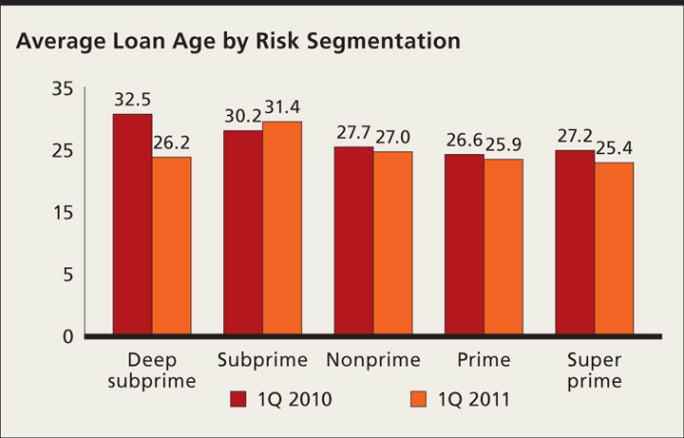 Loan age for all risk tiers except for subprime, which jumped by 1.22 months, experienced a drop from the first quarter of 2010 to the first quarter of this year. Loan age fell 1.82 months for superprime customers, 0.69 months for prime customers and 0.76 months for nonprime customers. Loan age for the deep subprime segment plummeted by 6.25 months.
