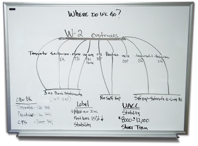 Greg Alore, head of Longmont Ford's special finance department, created a flow chart for tax season. It directs each customer's app to a lender or lenders based on his or her criteria for credit score, income, stability and stips.