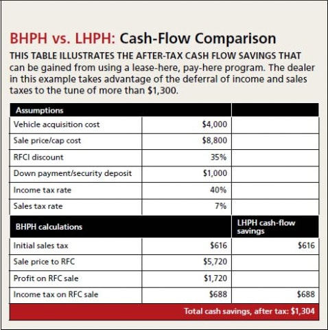2. Deferred federal and state income tax liabilities: In a BHPH conditional sale, there is a significant “gain on sale” when the vehicle is sold for an amount that is (typically) 50 to 100 percent greater than the dealer’s tax basis in the vehicle. To reduce the federal and state tax liabilities assessed on this gain, the retail installment sales contract is typically sold to a related finance company (RFC) at a discount. However, there is still upfront net profit that’s subject to federal and state taxation. With LHPH, there is no gain on the sale, because there is no sale! That eliminates the need to move the lease to an RFC in order to book a separate “loss on the sale of the lease.” Since the leased vehicle can be depreciated on an accelerated basis, the transaction starts with a tax loss from the accelerated depreciation, in effect, creating a tax shelter for the dealership.