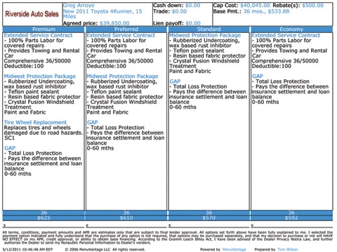 This sample menu from Wilson’s Riverside Auto Group shows the base offerings for a new 2011 Toyota 4Runner in four packages: Economy, Standard, Preferred and Premium.
