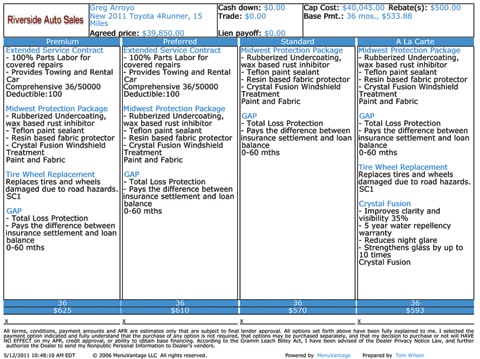 This sample menu has been customized to meet a customer’s F&I product needs. There are four F&I product packages: A La Carte, Standard, Preferred and Premium.
