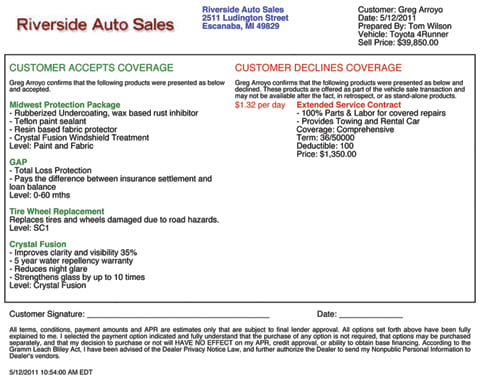 Riverside Auto Group presents this “Accept/Decline” form to each customer to confirm the F&I products he or she has selected or declined to purchase.