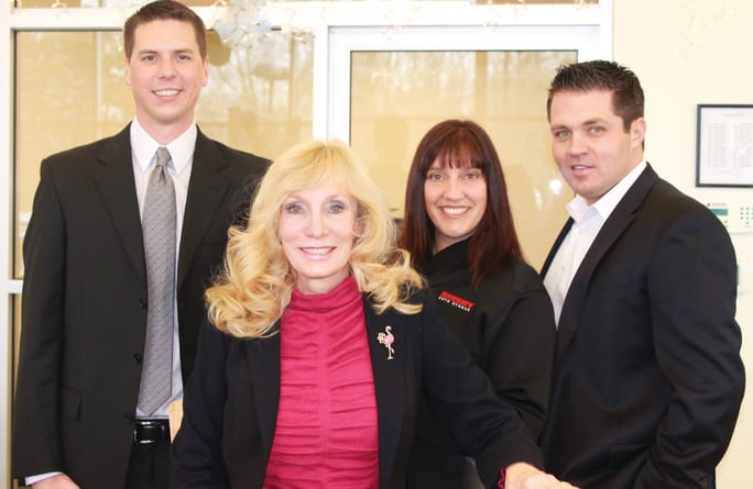Making the switch to The Impact Group’s Fusion menu required coordination between the group’s new menu maker, agent and F&I product provider. Pictured is the operation’s transition team, including Sheehy’s Ziropoulos, The Impact Group’s Garrett Thorpe, and the Automotive Development Group’s Bonnie Jean Hammett and John Hensley. Installation of the menus in all of the group’s 19 locations was completed in October.