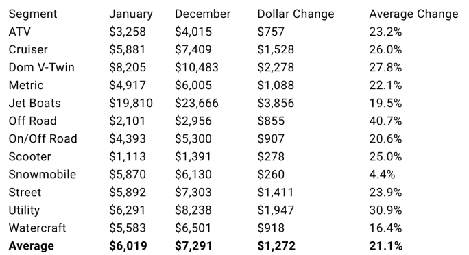 This is now the second month in a row where ALL segments we cover have increased in value. We are running out of ways to say this, but this is exceptional and unprecedented. At no time in the past can we recall not only the road going segments, but the watercraft and jet boats as well, increasing in value heading into December. In another month or two, we will be in the time period where these segments would normally begin to increase in value again. What happens when we get there will certainly be interesting. At some point these trends will not be sustainable. From January to today, our average Powersports vehicle has increased in price by a little over 21%.