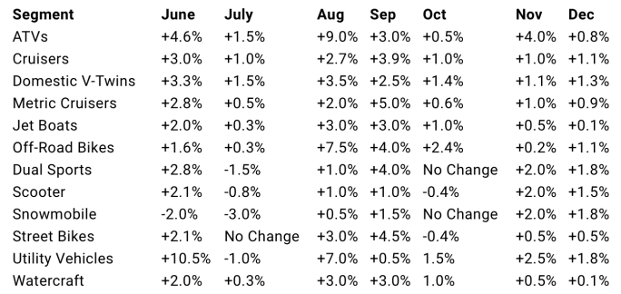 The incredible increase in demand for Powersports vehicles this year produced a tremendous increase in pricing across the industry. Among all ten major segments we cover in the Powersports market, the average increase in values (as measured by our 10-year Segment Index Average Values) was 21.1% for calendar year 2020. This ranged from a low of 4.4% for the Snowmobiles, to a high of 40.7% for the Off-Road bikes. Below is the full chart showing how each segment fared.