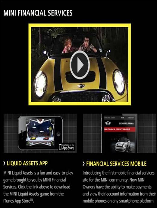 The MINI Financial Services Facebook page now has specialized content within the “World of MINI” tab, which highlights the MINI “Protection” viral video, the MINI Financial Services Mobile website, and the “Liquid Assets” game, which can be downloaded directly through a link to the iTunes App Store. The “World of MINI” tab can be found at facebook.com/MINIUSA.
