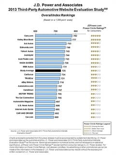 J.D. Power and Associates released results of its third-party automotive website evaluation study, and Cars.com tops the list. Also getting high marks were Kelley Blue Book and AOL Autos.