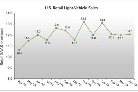 Total light-vehicle sales in April 2013 are projected to reach 1.312 million units, a 7 percent increase from April 2012. The selling rate is expected to remain above 15 million units for the sixth consecutive month. The forecast for fleet sales is 282,000 units, which is slightly stronger than in April 2012, representing a 22 percent share of total sales.