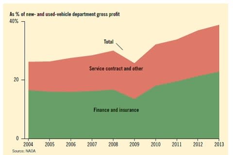 The NADA reported this week that combined sales from F&I, service contracts and other F&I products accounted for 38.8% of gross profit in 2013, up from 36.5% in 2012.