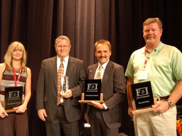 The Suburban Collection's Jodi Nicholson, Riverside Auto Group's Tom Wilson and Matt Dagenais, and Midland Honda's Robert Carter pose with their F&I Pacesetter of the Year awards.
