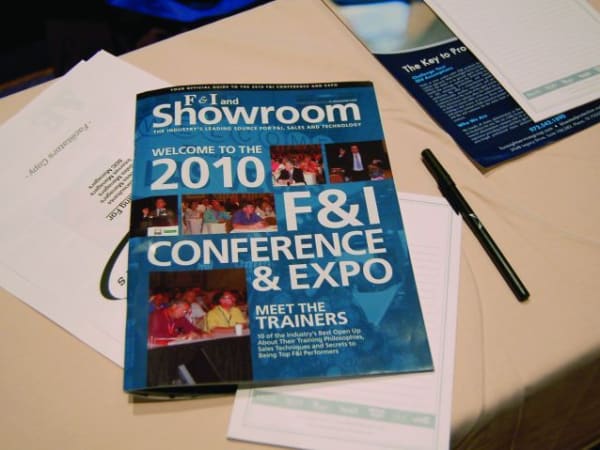 The 7th annual F&I Conference and Expo took place Sept. 14–15, 2010, at the Paris Las Vegas hotel and casino. The two-day show brought together dealer principals, F&I managers, business managers, trainers, agents and industry executives. The show featured keynote speeches, panel discussions and workshops covering F&I sales technique, deal structuring, compliance, Internet sales, mobile marketing, social media and more.