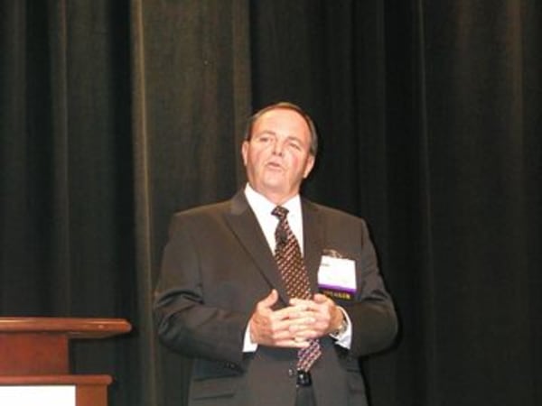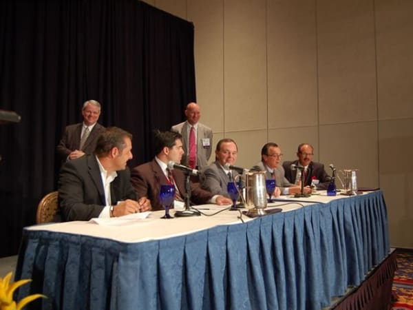 Building Value in Today's F&I Presentations panel session (left to right): (moderator) Rick McCormick, Reahard and Associates; Patrick DeMarco, Ristken Software Services; Jim Maxim Jr., MaximTrak Technologies; (emcee) Tony Dupaquier, American Financial & Automotive Services; Ron Martin, The Vision of F&I, "Mad" Marv Eleazer, <i>F&I</i> columnist.