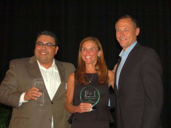 F&I and Showroom's Gregory Arroyo and The Warranty Group's Ash Bauer pose with Vaden Automotive Group's Jane Vaden Thacher, who was name the magazine's F&I Dealer of the Year award.
