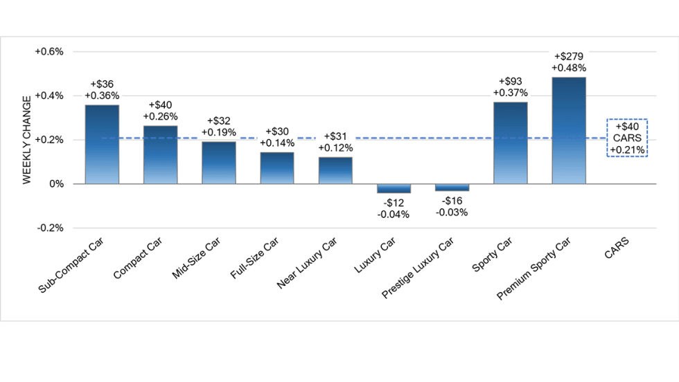 Sporty Cars traditionally decline during this time of year, but the segment is still reporting increases with an average weekly increase of +0.24% over the last eleven weeks.