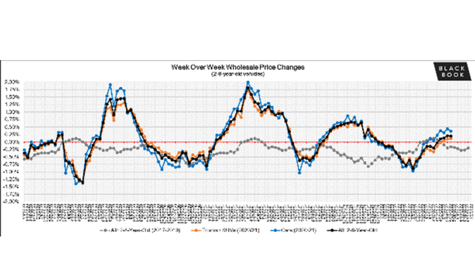 The car market continued its ascent last week, with the rate of gain accelerating to 0.23%, larger than the typical increase for this time of year.