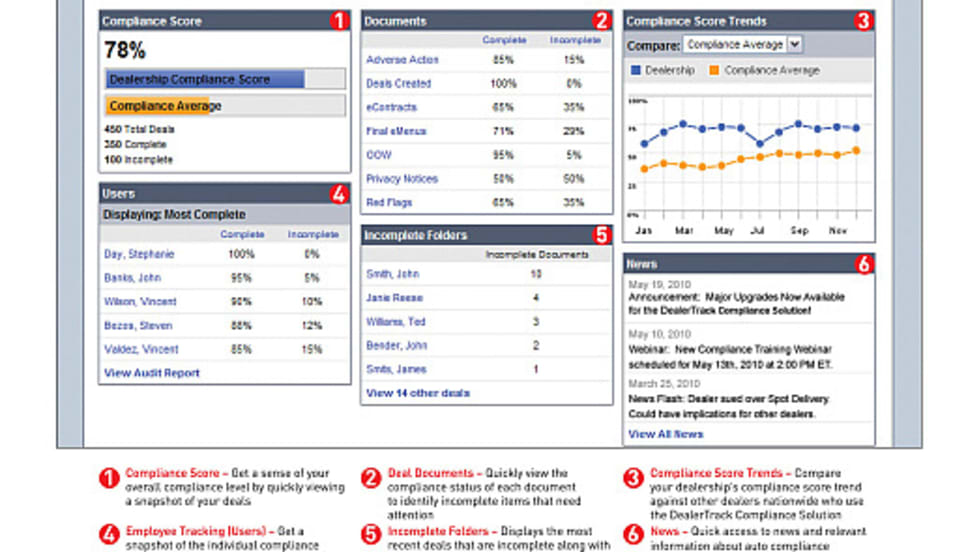 Software provider DealerTrack Inc. enhanced its compliance solution with the addition of the new Compliance Dashboard tool, which provides an overview of compliance-related activity on a dealership's current deals on a single screen.