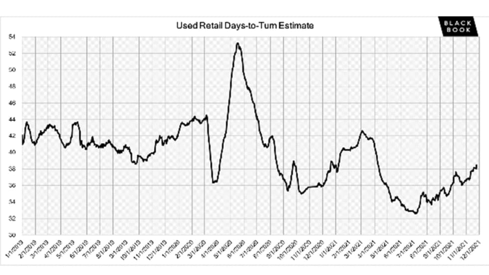 Days-to-turn for used retail listings have slightly increased and now sits just above 38 days, which is still lower than what is typically expected.